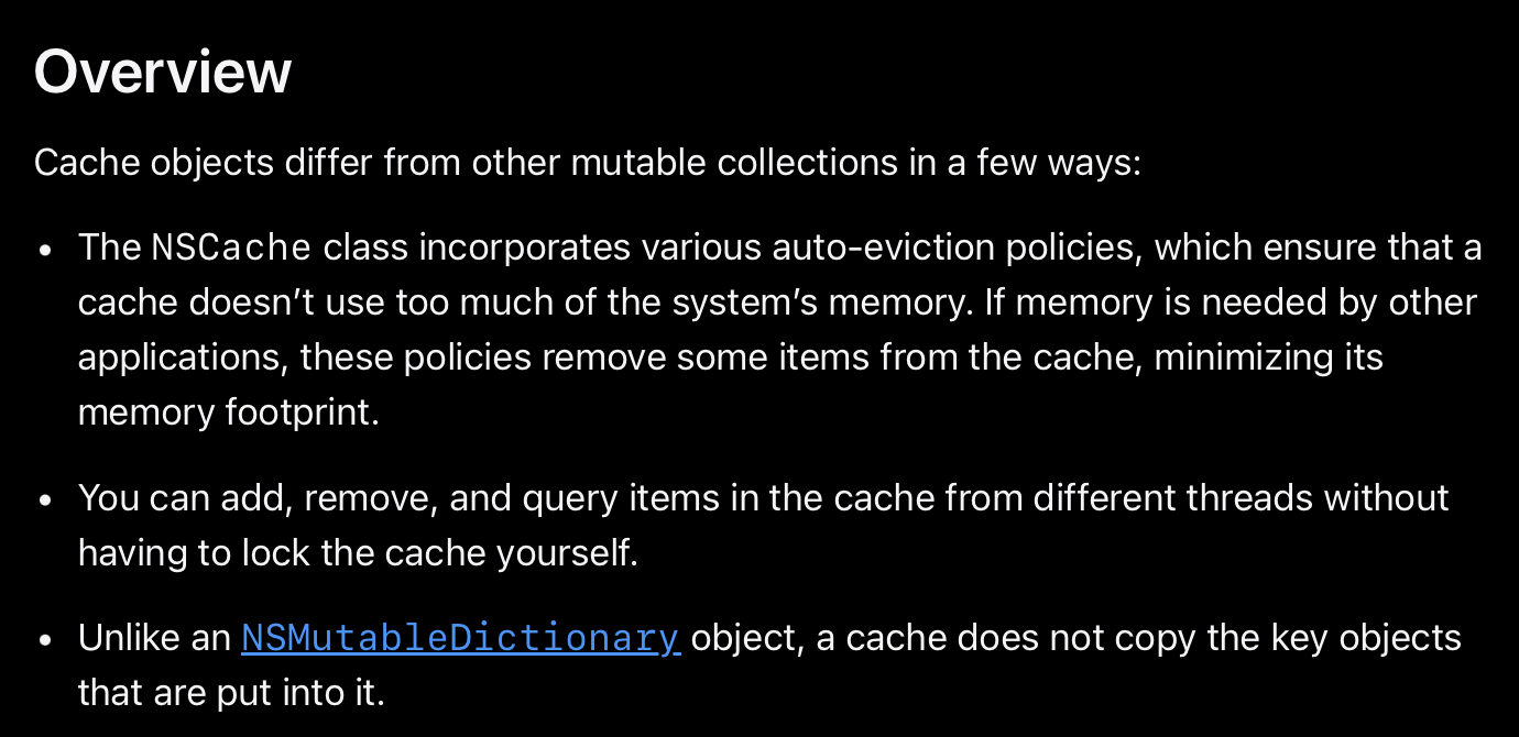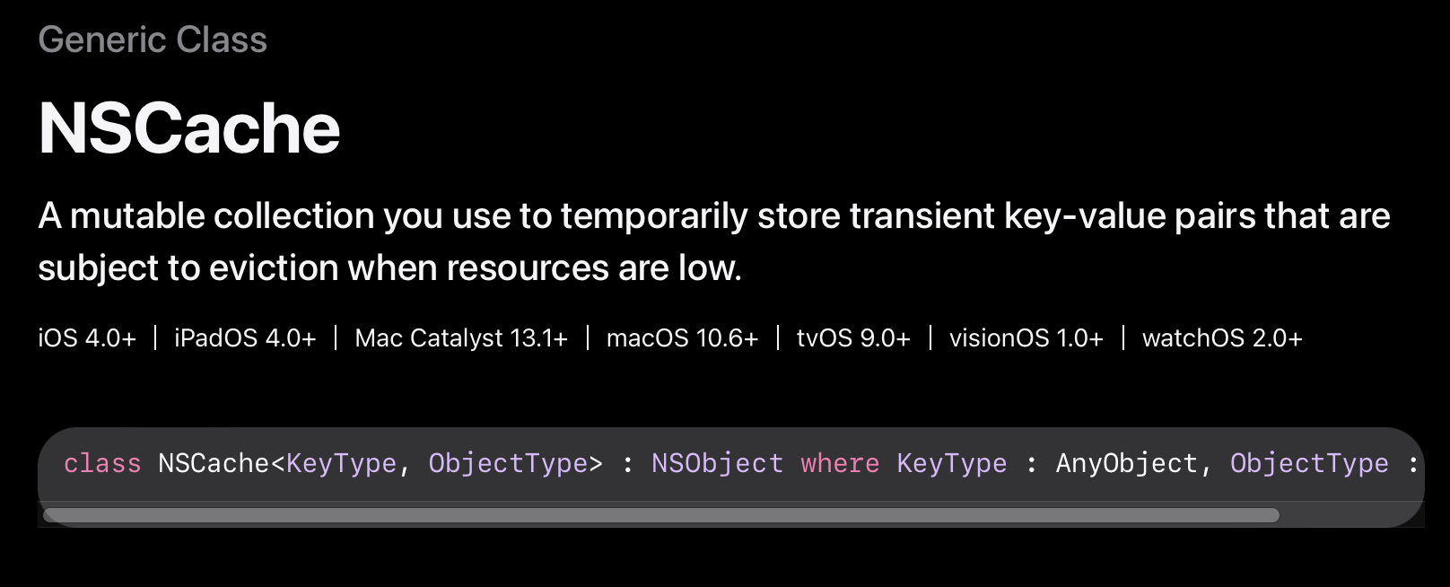 이러한 제약이 있는 이유는 NSCache가 Objective-C 런타임과의 호환성을 위해 설계되었기 때문